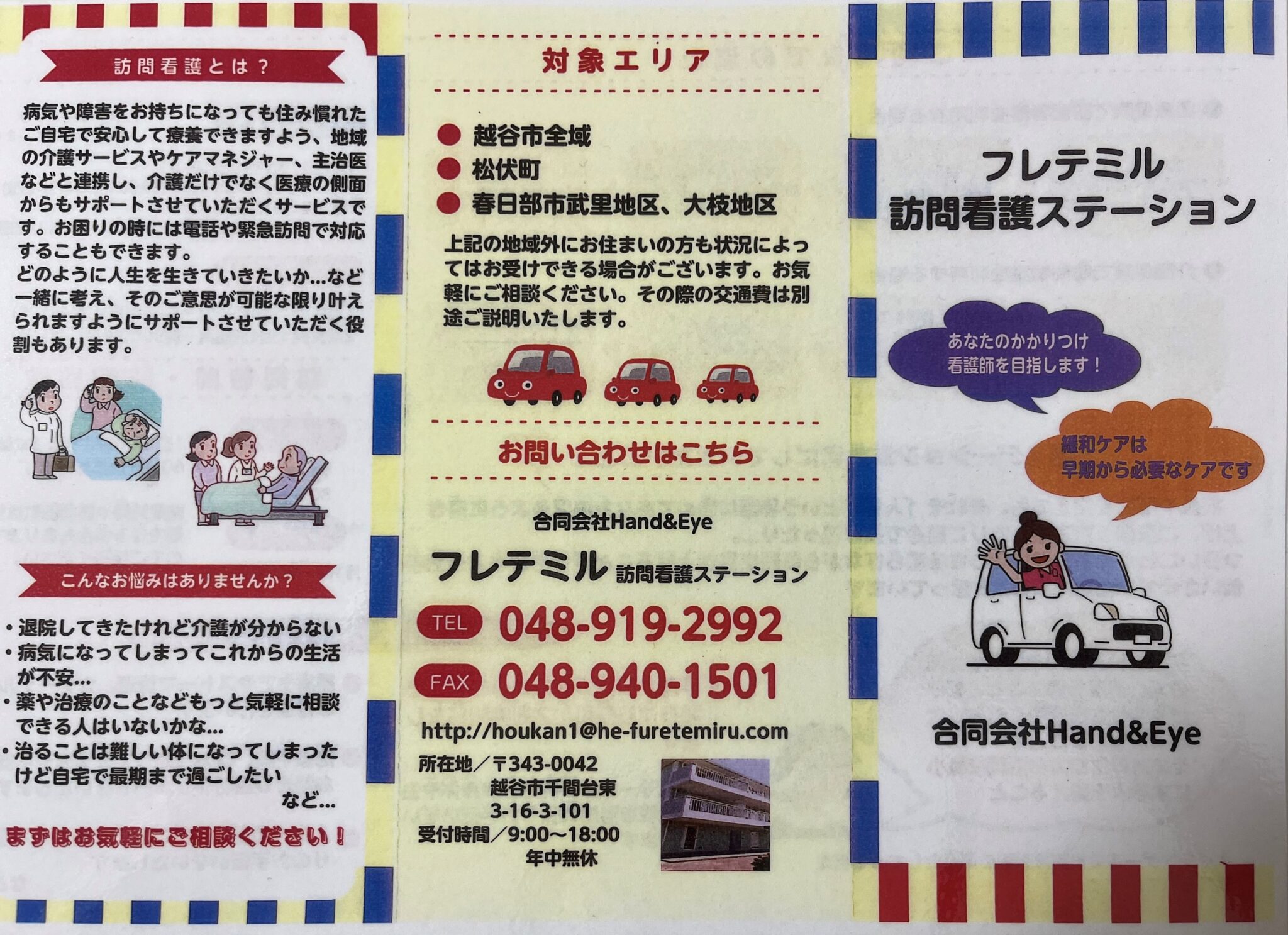 越谷市千間台東3丁目に事務所があります。管理者が緩和ケア認定看護師のため、がんの方に限らず非がんの方にももちろん、緩和ケア全般、お看取りや意思決定支援にも力を入れているステーションです。日々、学ぶことが多い職場環境だと思います。